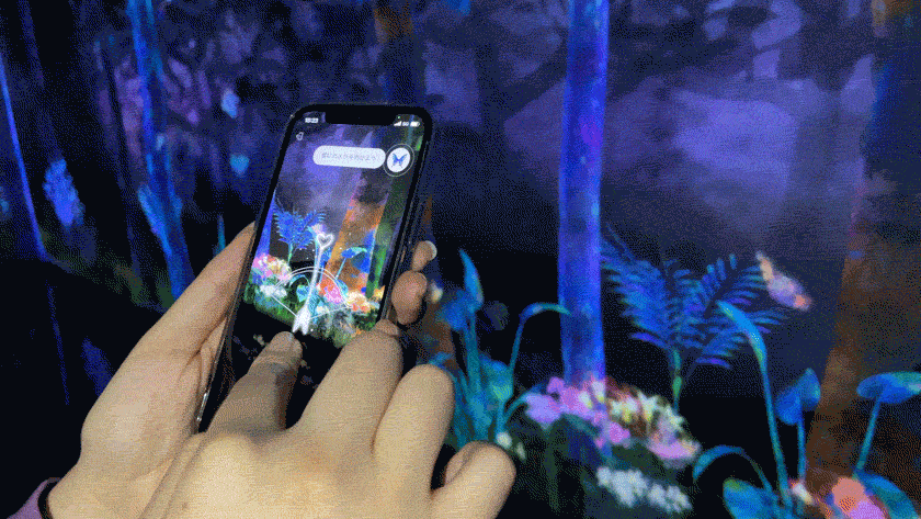 『GINZA 456 & チームラボ:捕まえて集める境界のない群蝶』は、幻想的な森のなかにあらわれる蝶の映像体験で、壁面に舞う蝶の森を鑑賞し、触れて楽しむことができる。それだけでなく、作品空間内を飛んでいる蝶を自分のスマホで捕まえて集めることもできる。空間を飛ぶ蝶が、壁面を超えて自分の手元のスマホのなかにもボーダレスに出現するというわけだ。