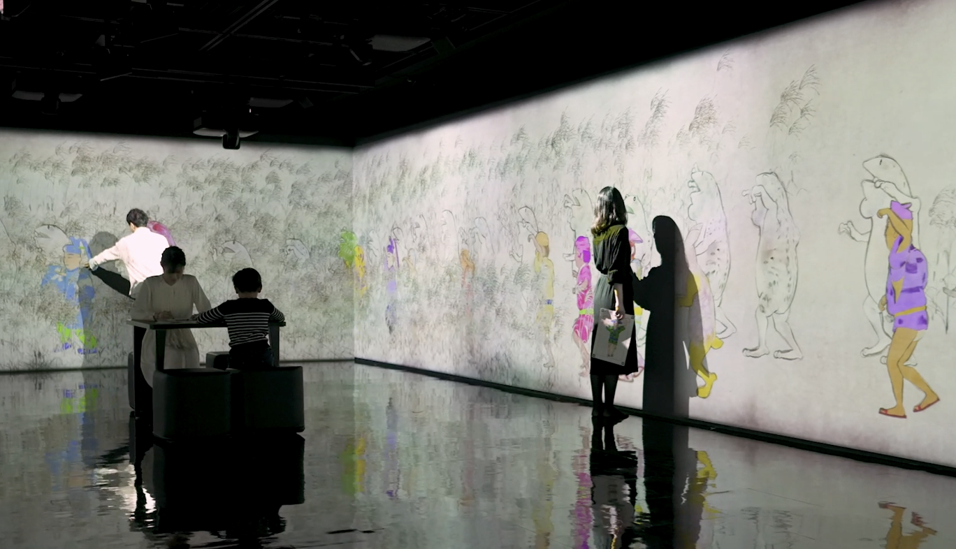 穏やかな光に包まれた壁面を、まるで鳥獣戯画のように、古典に出てくる貴族や農民、カエルやウサギなどのキャラクターが踊りながら行進している。スペース内に流れる和楽器の音と相まって、幻想的でどこか懐かしい世界がそこに広がる。