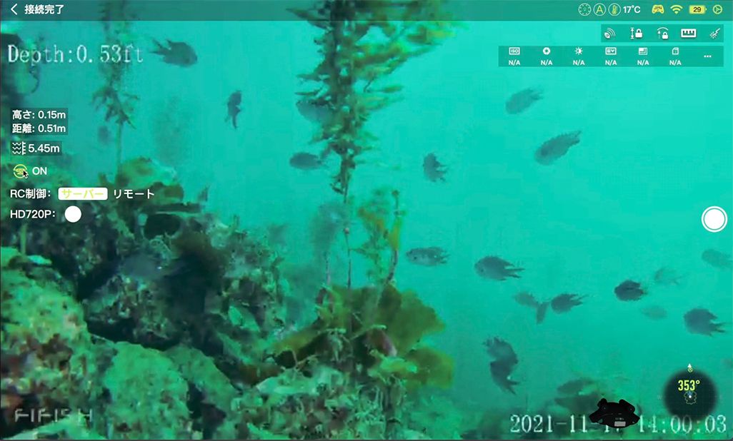 水中ドローンのカメラが水中の様子を撮影し、通信ケーブルを通じて、海上の親機からリアルタイムに陸上へと配信される。
